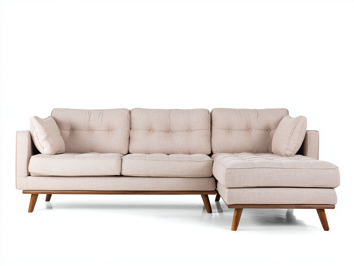 Questo divano angolare in tessuto beige è progettato con una chaise longue per offrire un’ampia area di relax e un comfort elevato nel soggiorno.