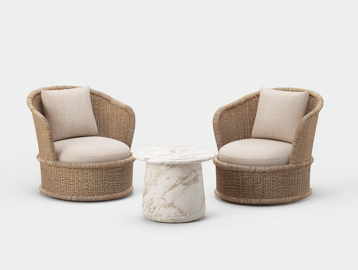 Le poltrone sono realizzate in rattan sintetico intrecciato con una struttura stabile. Il tavolino segue lo stesso stile e offre un piano pratico per appoggio oggetti.